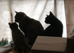 また、農場には日々の楽しみもある。昨年の晩秋、作業場に野良猫の家族(両親と子猫の3匹)が来始めた。段ボール箱を加工した寝床を作ってあげたら、暖かさと安全が得られたためか作業場に住み着いた。オス猫は自分の子どもさえ世話をしないと聞いていたが、そんなことはないようだ。両親は根っからの野良なので今でも警戒心を抱いているが、子猫は農場育ちのためか名前を呼ぶとすっ飛んでくる。撫でてあげると、気持ち良さそうな声を出す。かわいい。お陰で、私の寿命が延びた気がする。